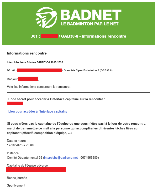 Quelques jours avant la rencontre le capitaine reçoit un mail de Badnet au sujet de la rencontre.