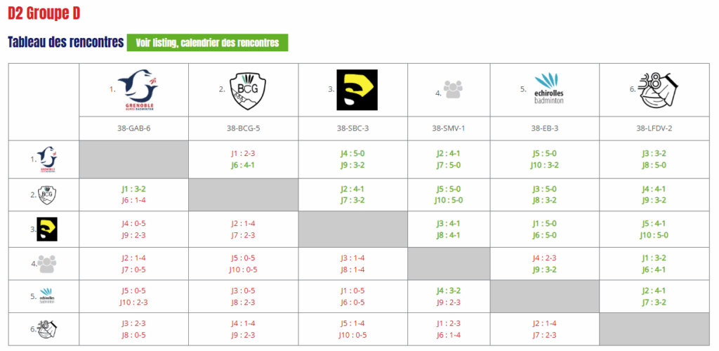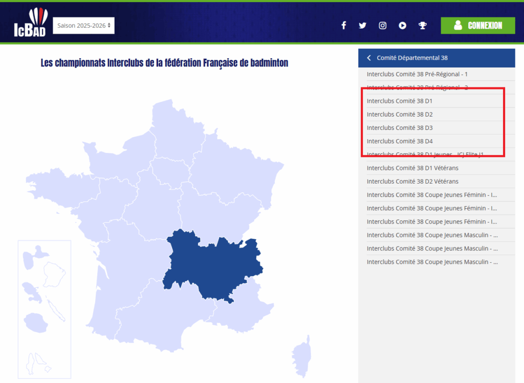 Il est possible de retrouver toutes les équipes en fonction des divisions et des poules sur le site IcBad mis en place par la fédération.