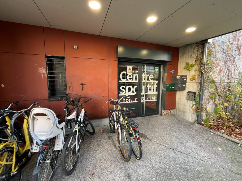 L’accès au gymnase se fait au même endroit que la piscine mais par la porte de droite. Les terrains de badminton sont situés au 2ème étage. Les vestiaires sont situés entre les escaliers et les terrains.